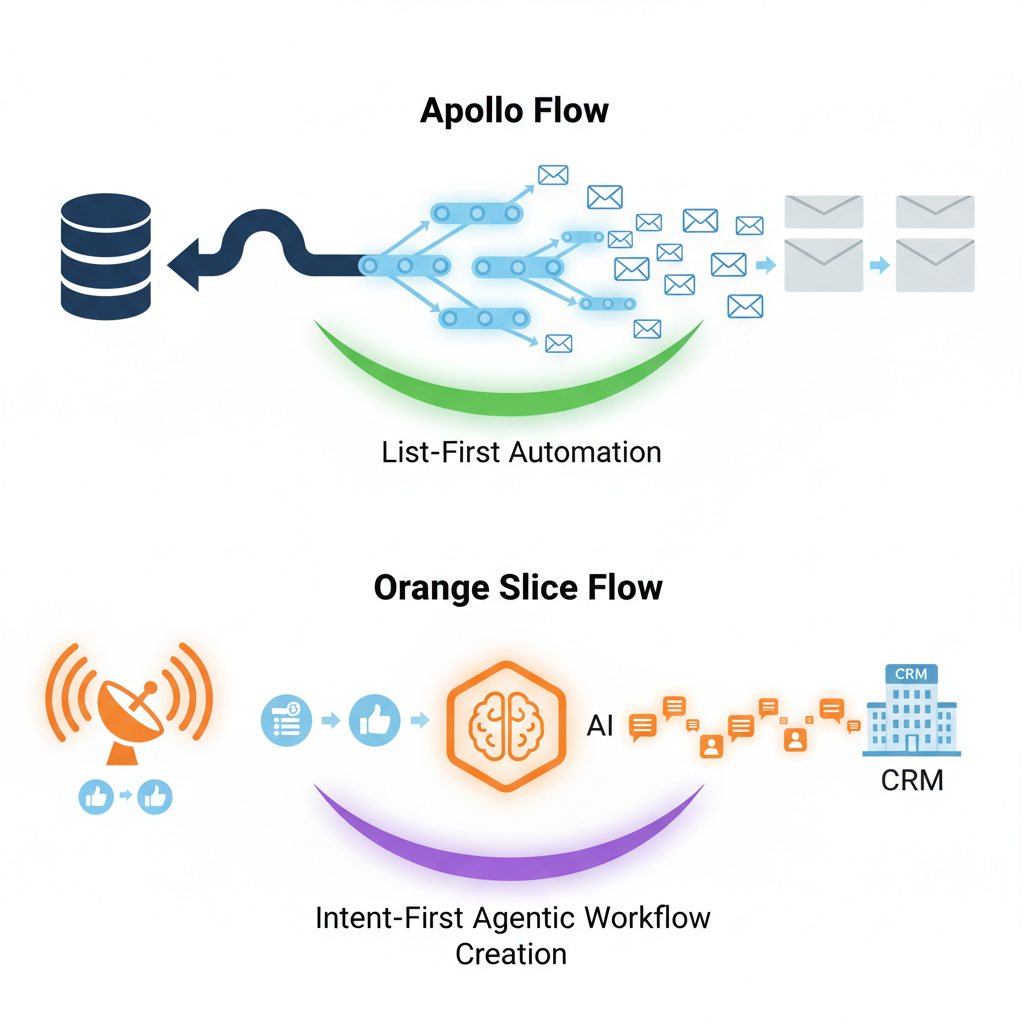 Orange Slice's agentic AI starts with intent signals to find the right people to reach, while Apollo's automation begins with its database to reach more people faster. This difference highlights Orange Slice's focus on precision and timing.